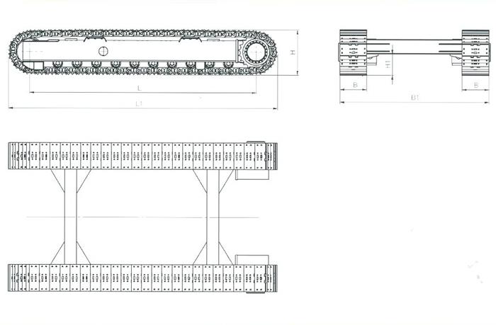 | 中心距L | 底盤總長L1 | 履帶板寬B | 底盤外寬B1 | 底盤高度H | 離地高度H1 | 單速 | 雙速 | ||