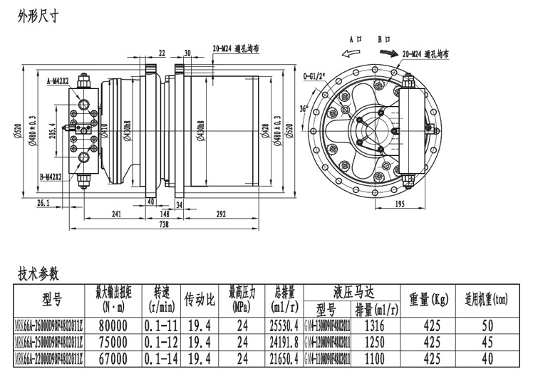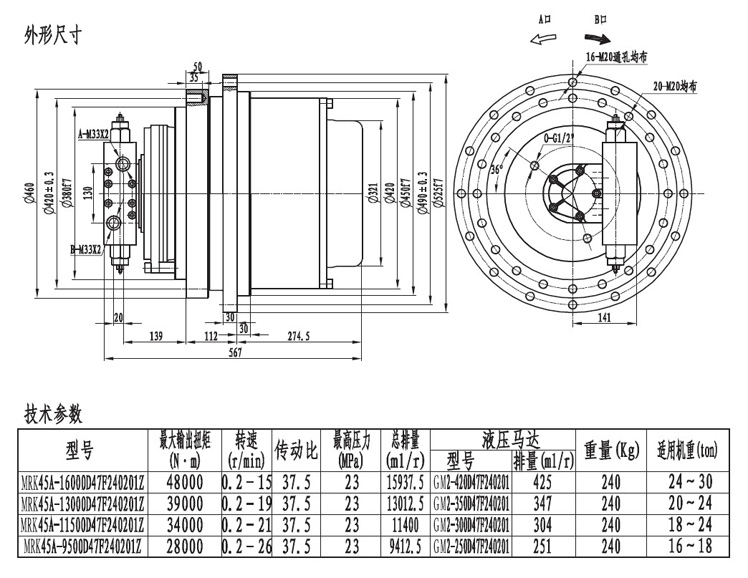MRK45系列以上的行走減速機輸出扭矩在40000扭米以上,最大到十萬扭米,可采用柱塞馬達或者斜軸馬達驅(qū)動。一般用在大型履帶底盤或者輪式行走用。